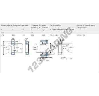 The Roller Bearing, known as NJ314-ECJ-SKF SKF, has an inner diameter of 70 mm, an outer diameter of 150 mm and a thickness of 35 mm.