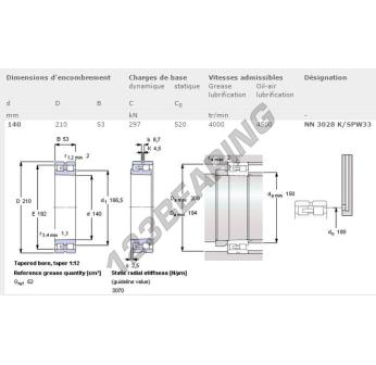 The Roller Bearing, known as NN3028K-SPW33-SKF SKF, has an inner diameter of 140 mm, an outer diameter of 210 mm and a thickness of 53 mm.