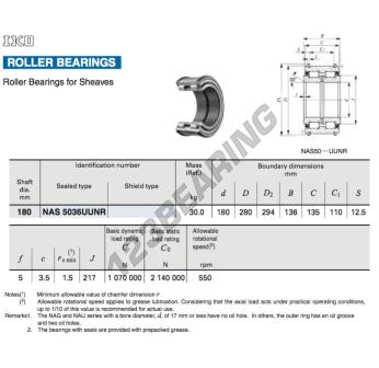 The Roller Bearing, known as SL045036-PPX-IKO IKO, has an inner diameter of 180 mm, an outer diameter of 280 mm and a thickness of 136 mm.