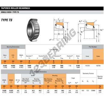 The Tapered Roller Bearing, known as 14137A-14275A-TIMKEN TIMKEN, has an inner diameter of 34.93 mm, an outer diameter of 69.85 mm and a thickness of 19.85 mm.