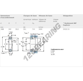 The Tapered Roller Bearing, known as 30324-J2-SKF SKF, has an inner diameter of 120 mm, an outer diameter of 260 mm and a thickness of 59.5 mm.