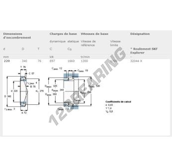 The Tapered Roller Bearing, known as 32044X-SKF SKF, has an inner diameter of 220 mm, an outer diameter of 340 mm and a thickness of 76 mm.
