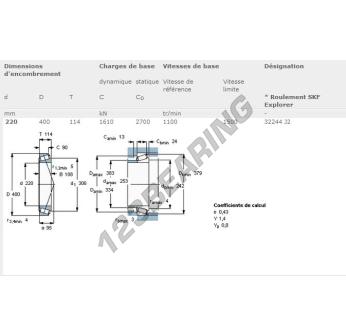 The Tapered Roller Bearing, known as 32244-J2-SKF SKF, has an inner diameter of 220 mm, an outer diameter of 400 mm and a thickness of 114 mm.