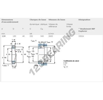 The Tapered Roller Bearing, known as 33024-SKF SKF, has an inner diameter of 120 mm, an outer diameter of 180 mm and a thickness of 48 mm.