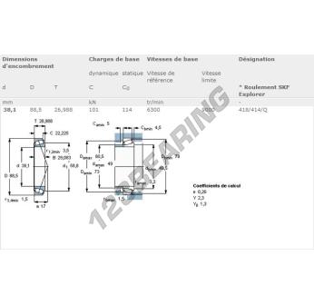 The Tapered Roller Bearing, known as 418-414-Q-SKF SKF, has an inner diameter of 38.1 mm, an outer diameter of 88.5 mm and a thickness of 26.99 mm.
