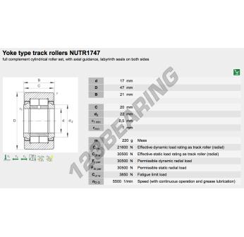 The Yoke Type Track Roller, known as NUTR1747-A-INA INA, has an inner diameter of 17 mm, an outer diameter of 47 mm and a thickness of 21 mm.